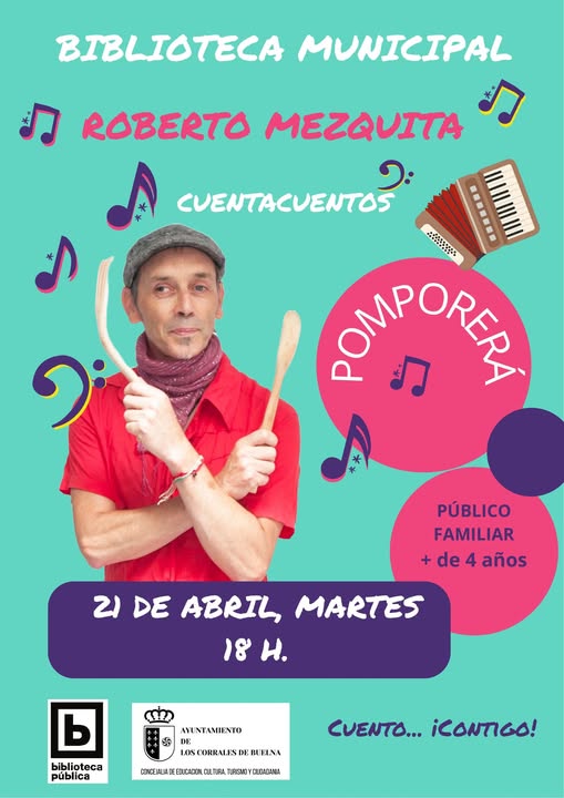 La Biblioteca Municipal de Los Corrales de Buelna celebrará el mañana martes 21 de abril a las 18:00 horas una actividad cultural dirigida a toda la familia de la mano de Roberto Mezquita. Se trata de “Pomporerá”, un espectáculo de cuentacuentos que combina narración oral y música en directo, pensado especialmente para público a partir de 4 años. El evento se enmarca dentro de la programación especial organizada con motivo del Día del Libro.