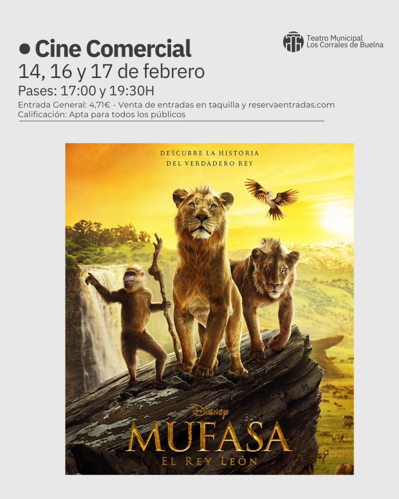 No te pierdas este finde semana la proyección de la película ‘Mufasa: El rey león’, en el Teatro Municipal de Los Corrales de Buelna. Días: 14, 16 y 17 de febrero. Hora: 17:00 y 19:30 h. Lugar: Teatro Municipal de Los Corrales de Buelna. Entrada general: 4,71€ venta de entradas en taquilla y en reservaentradas.com Rafiki, Timón y Pumba […]