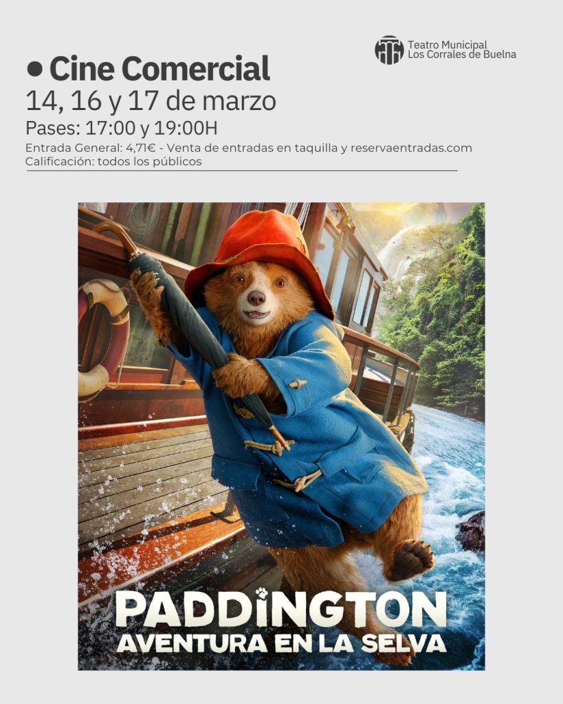 No te pierdas este finde semana la proyección de la película española ‘Paddington: Aventura en la selva’, en el Teatro Municipal de Los Corrales de Buelna. Días: 14, 16 y 17 de marzo. Hora: 17:00 y 19:00 h. Lugar: Teatro Municipal de Los Corrales de Buelna. Entrada general: 4,71€ venta de entradas en taquilla y en reservaentradas.com Paddington y la […]