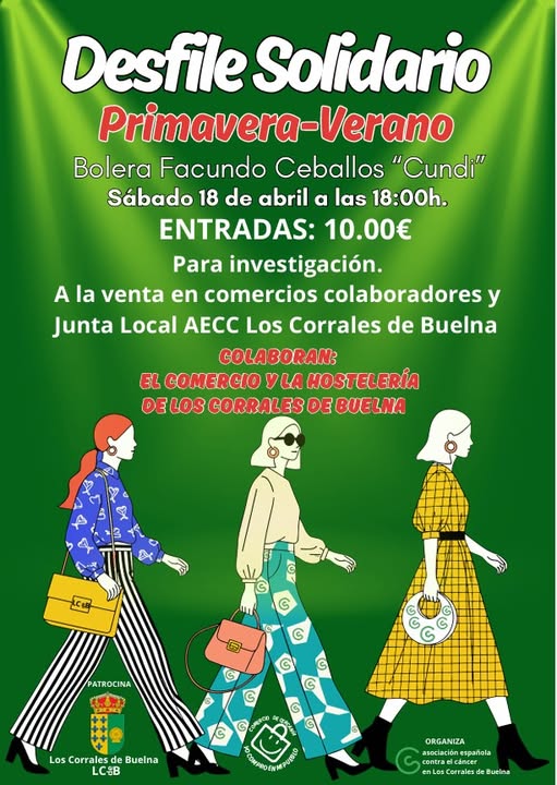 Los Corrales de Buelna celebrará el próximo sábado 18 de abril, a las 18:00 horas, un Desfile Solidario de Moda Primavera-Verano con fines benéficos. El evento tendrá lugar en la Bolera Facundo Ceballos “Cundi” y está organizado por la Junta Local de la Asociación Española Contra el Cáncer (AECC) en colaboración con el comercio y la hostelería del municipio.