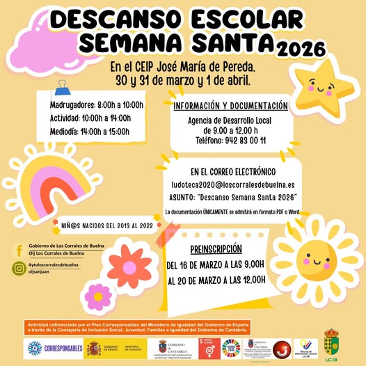 El Ayuntamiento de Los Corrales de Buelna ha puesto en marcha una nueva edición del programa Descanso Escolar Semana Santa 2026, una iniciativa dirigida a facilitar la conciliación familiar durante el periodo vacacional.