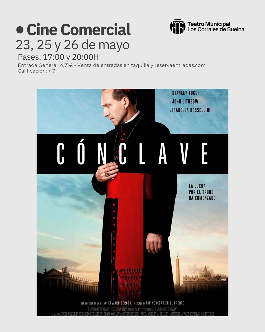 No te pierdas este finde semana la proyección de la película del momento ‘Cónclave’, en el Teatro Municipal de Los Corrales de Buelna. Días: 23, 25 y 26 …